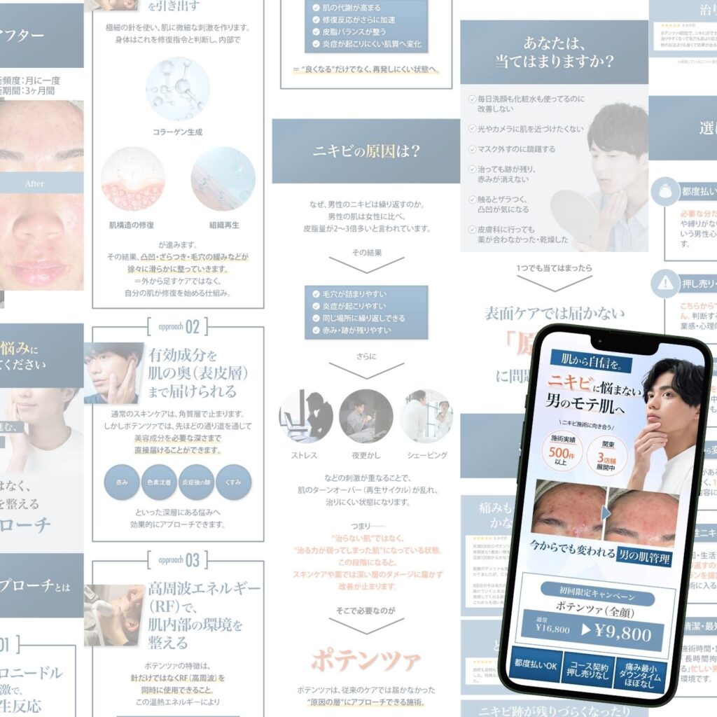 20〜40代男性をターゲットにした、ニキビ治療「ポテンツァ」の集客用ランディングページを制作しました。男性向けの構成でありながら、美容サロンとしての高級感と信頼性を両立させるデザインを意識しています。